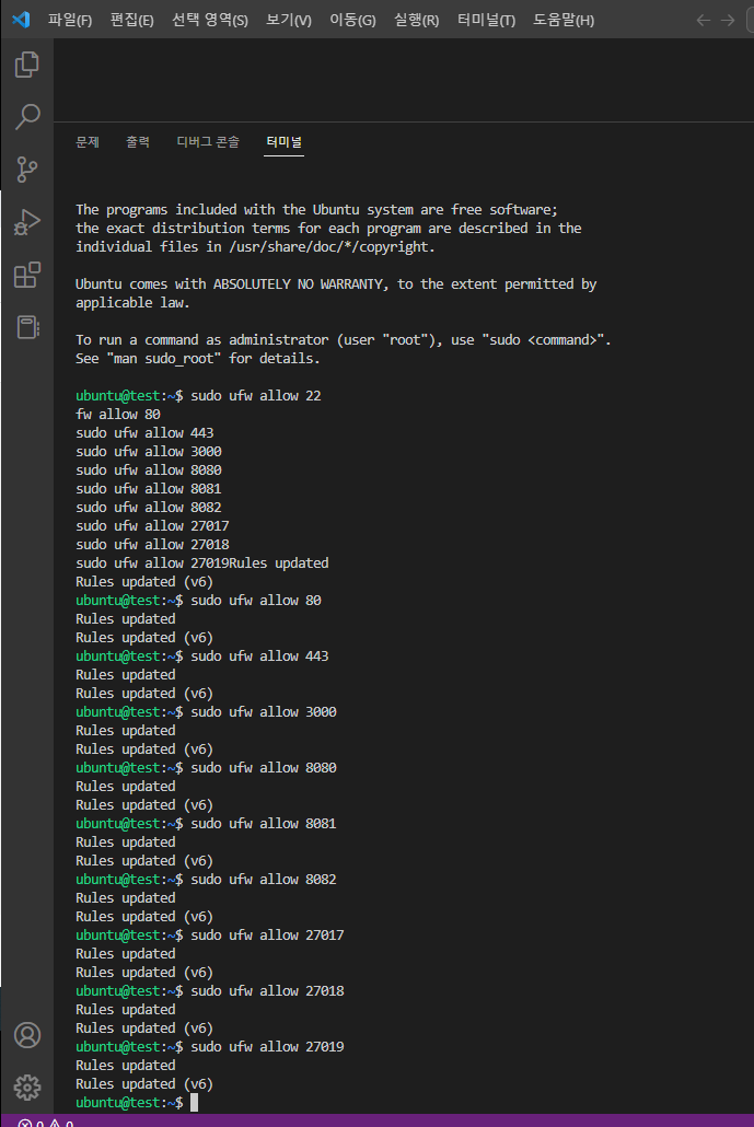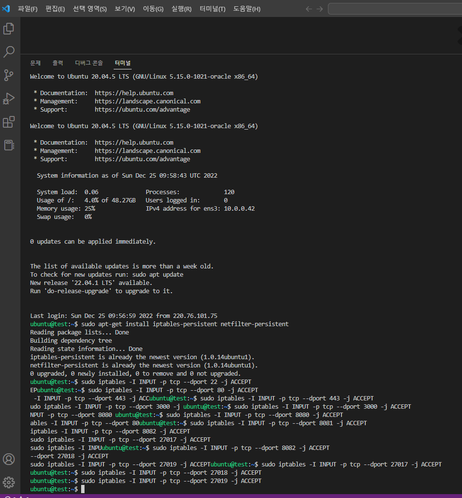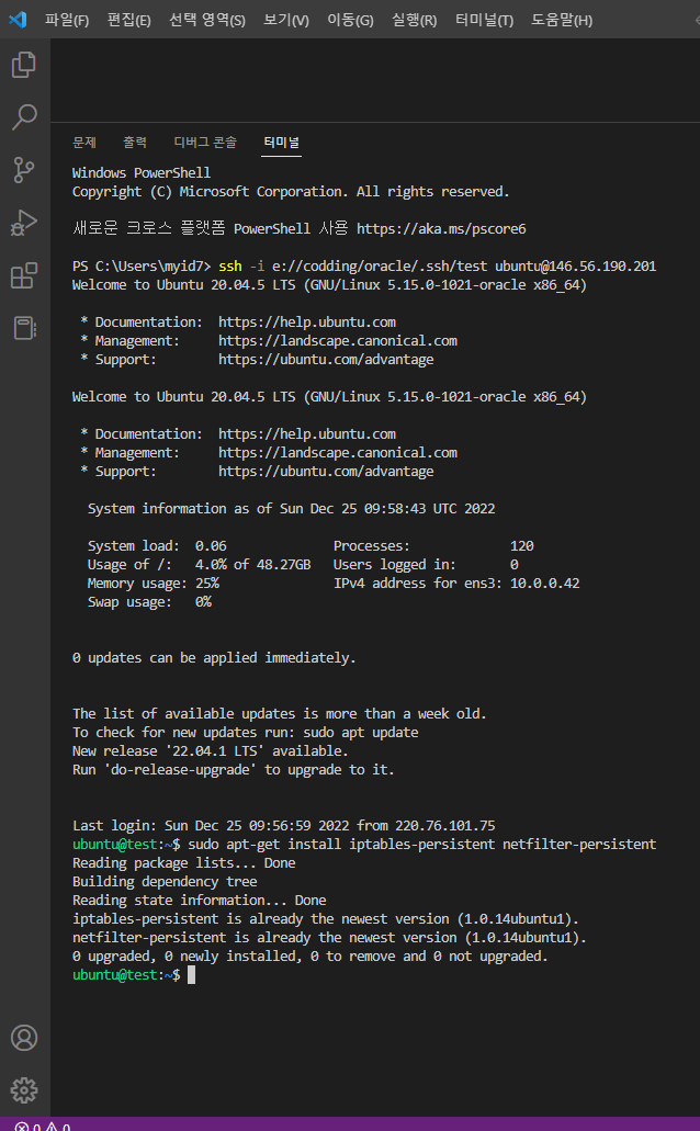 1. 인스턴스 접속(편하게 복붙 하려고 vscode을 관리자권한으로 실행한 터미널창)