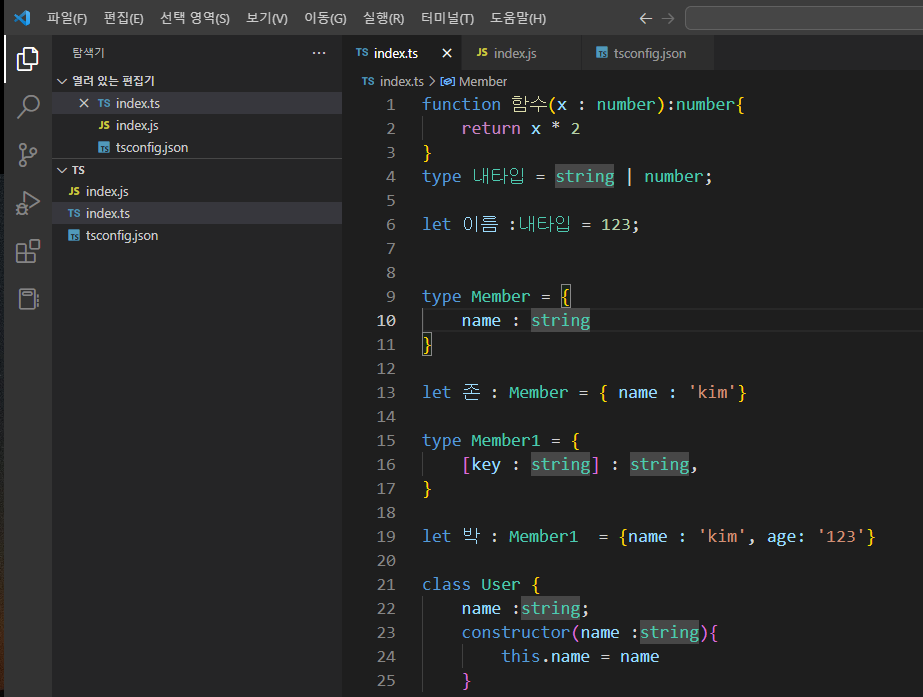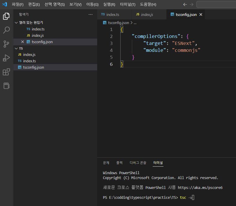 4.. ts 파일 만들고 tsc -w 터미널창에 켜주면 스크립트 작성하고 저장 시마다. js 파일로 변환