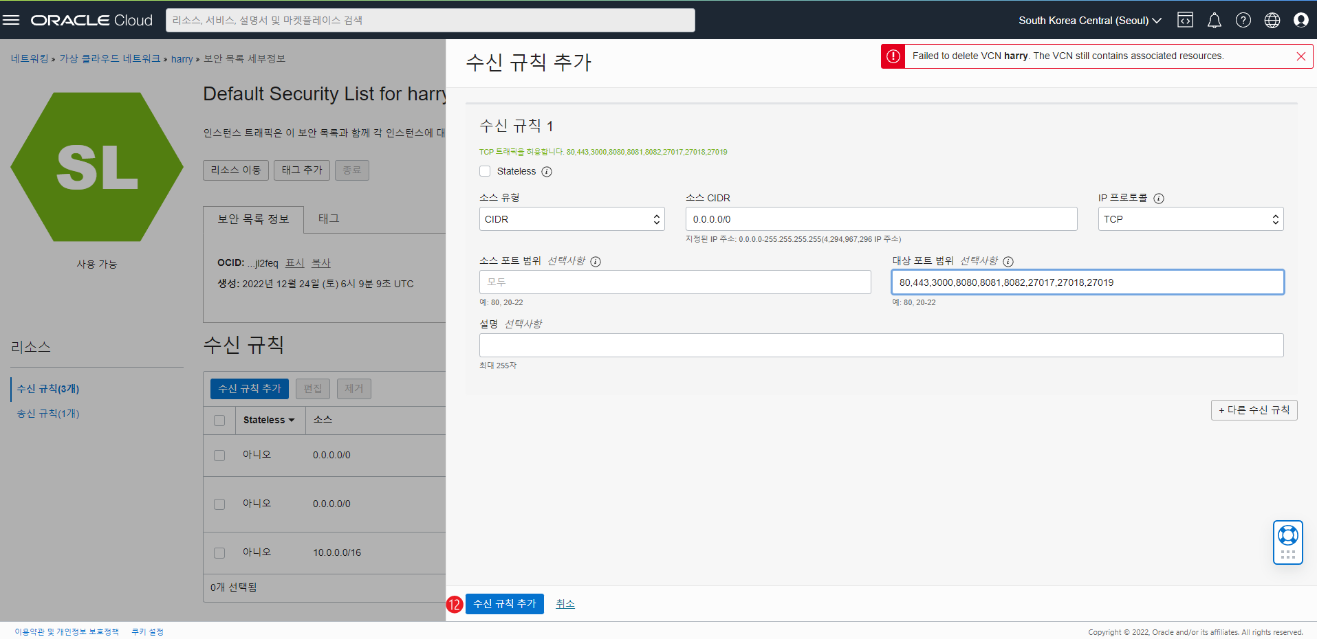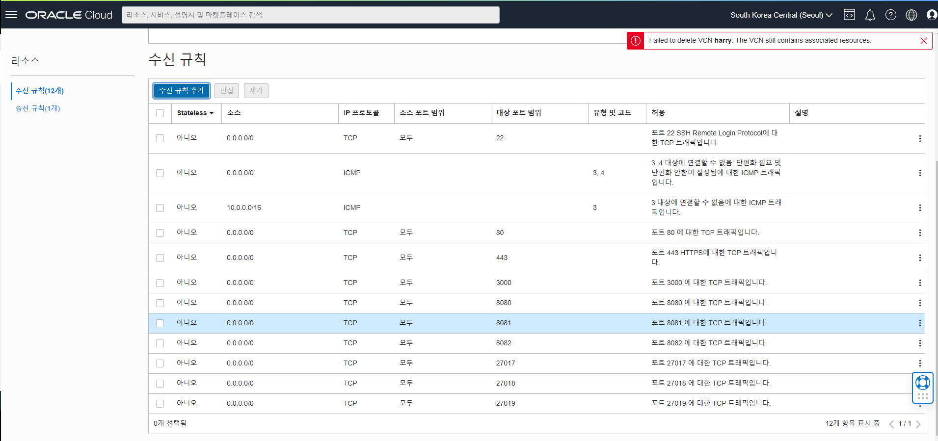 ▶ 생성버튼 ▶ 이름 클릭 ▶ 공용-서브넷 클릭 ▶ 잡영어 클릭 ▶ 수신 규칙 추가 ▶ 자주 쓰는 포트 설정