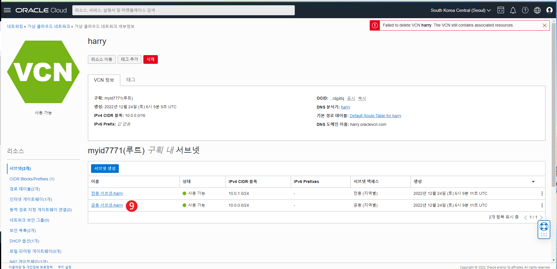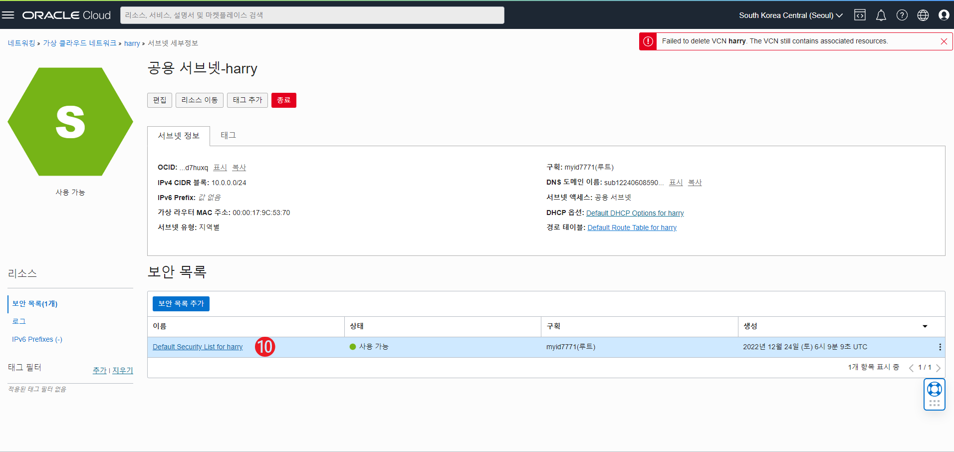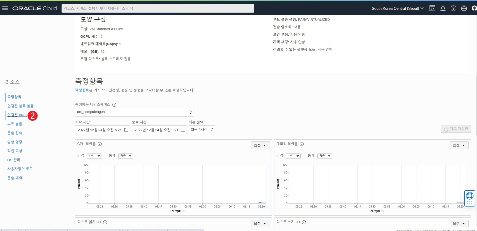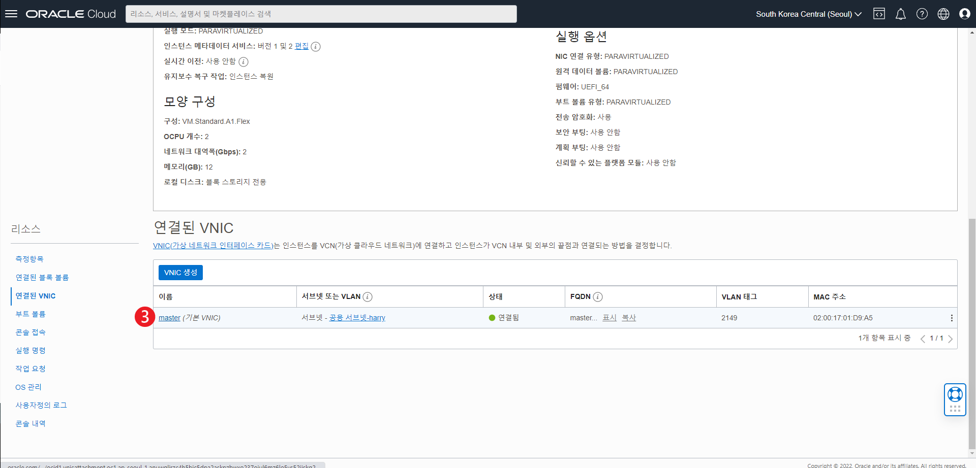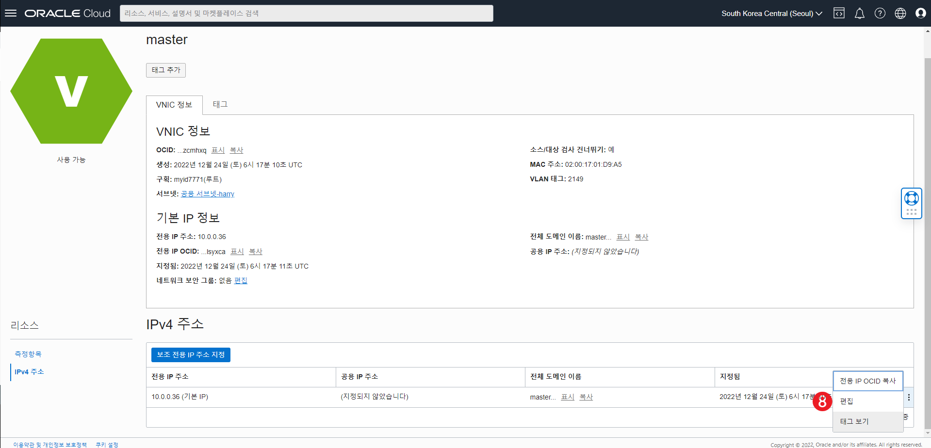6. 인스턴스 목록에서 각각 인스턴스 설정 : 이름 클릭 ▶ 연결된 VNIC 클릭 ▶ 이름 클릭 ▶ IPv4 주소 클릭