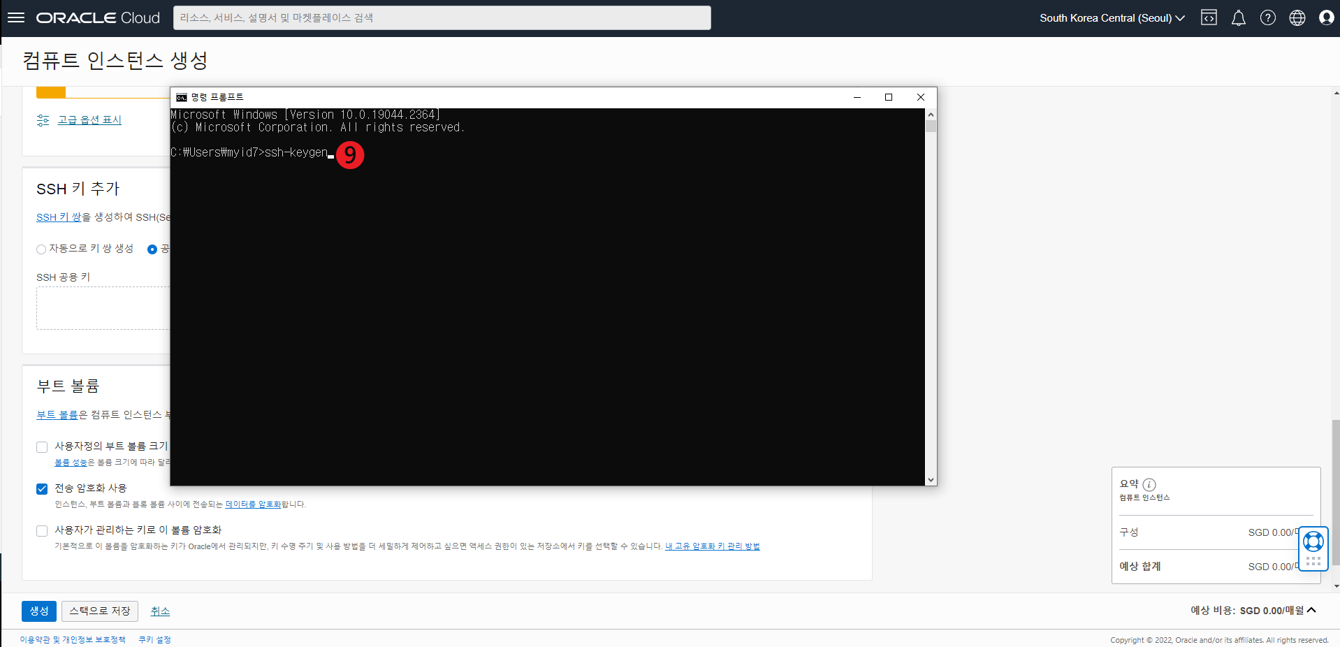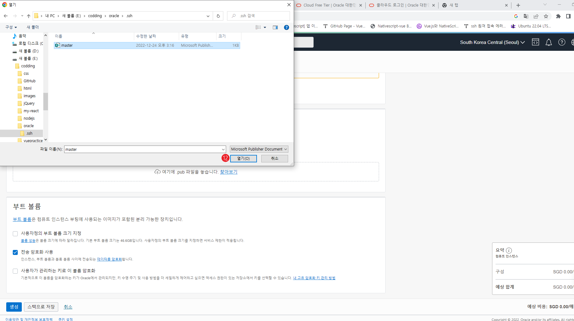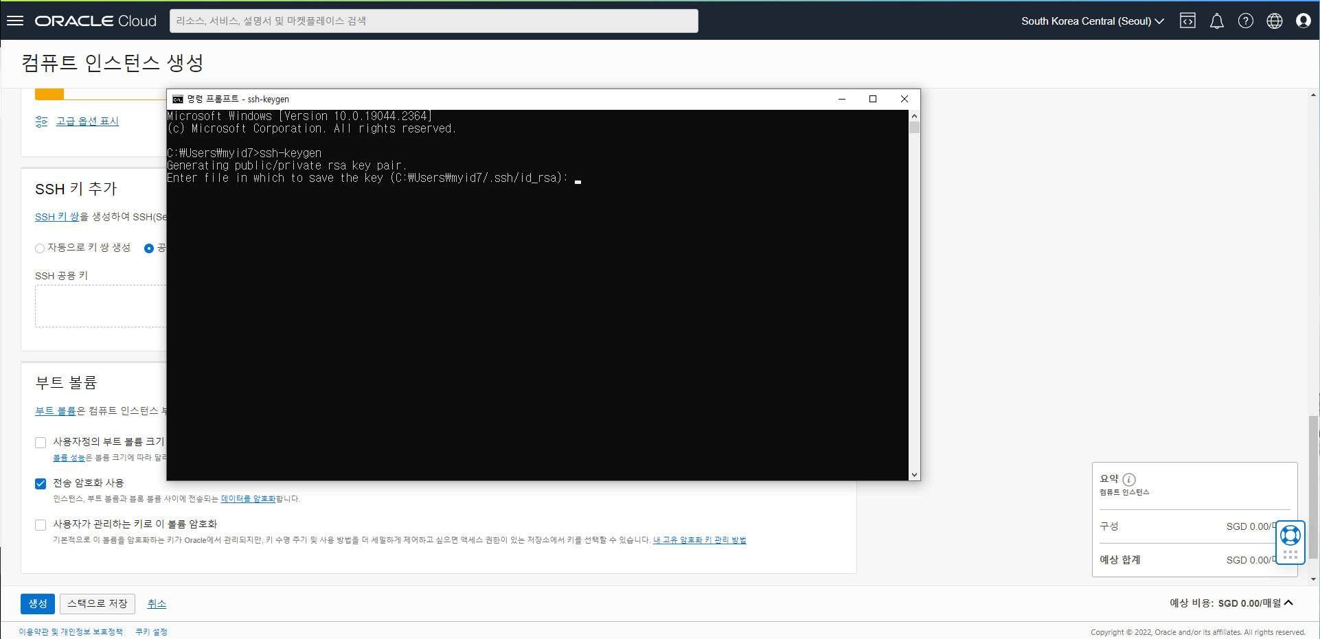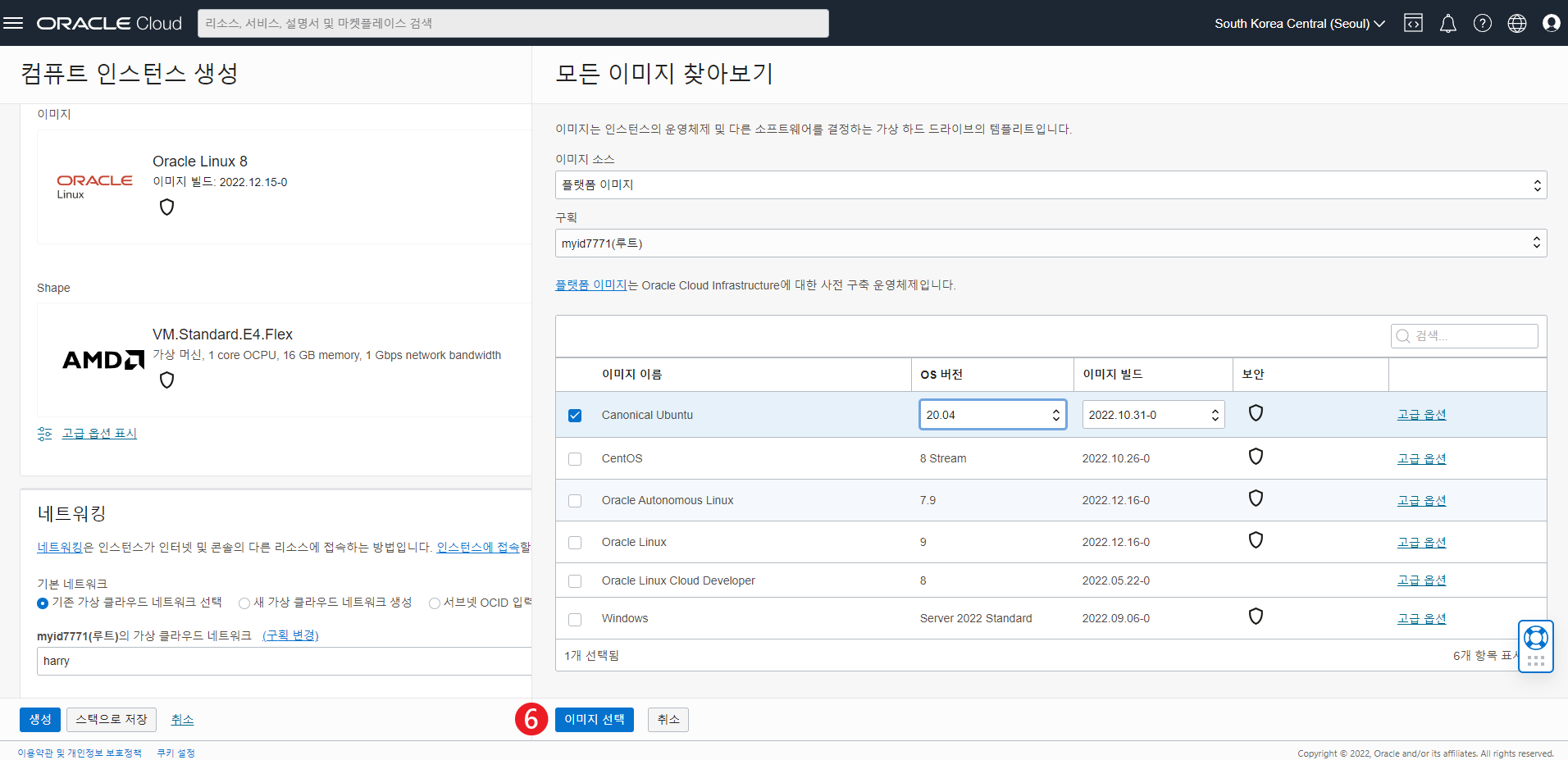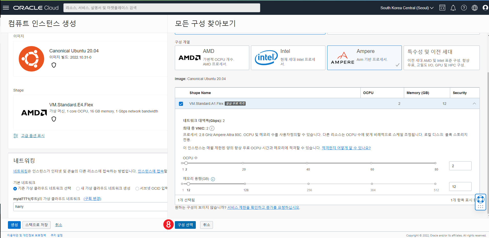 5. 메뉴에서 컴퓨트 ▶ 인스턴스 ▶ 인스턴스 생성 ▶ 이름작성 ▶ 이미지 변경 ▶ 우분투 20.04 버전 ▶ Change Shape ▶ Arm 2 CPU 12 RAM ▶ 콘솔창 ssh-keygen ▶ key 파일 저장경로. ssh 파일 안 ▶ 공용 키 파일 업로드