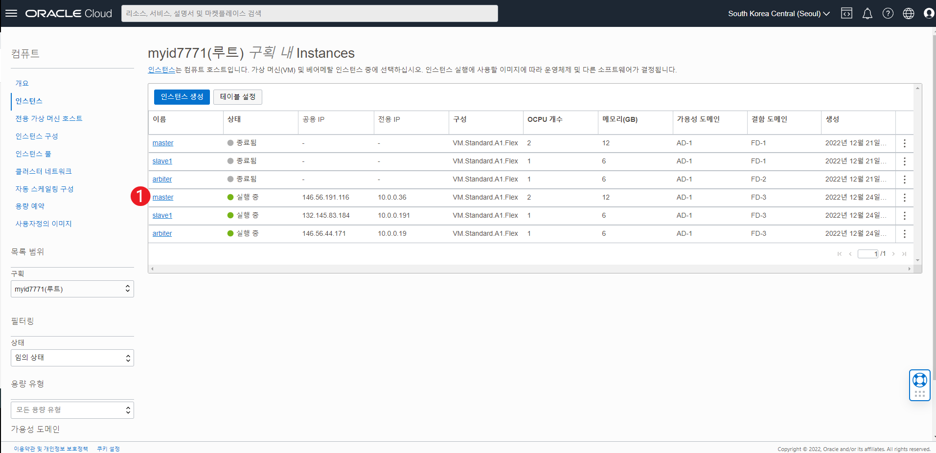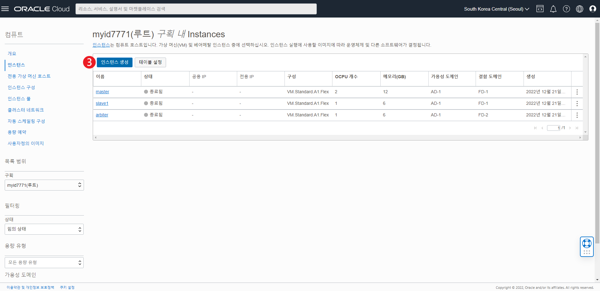 3. oracle cloud free tier에서 지원하는 내에서 총 3개의 OCI(각각 master, slave1, arbiter 역할)를 생성하겠습니다.