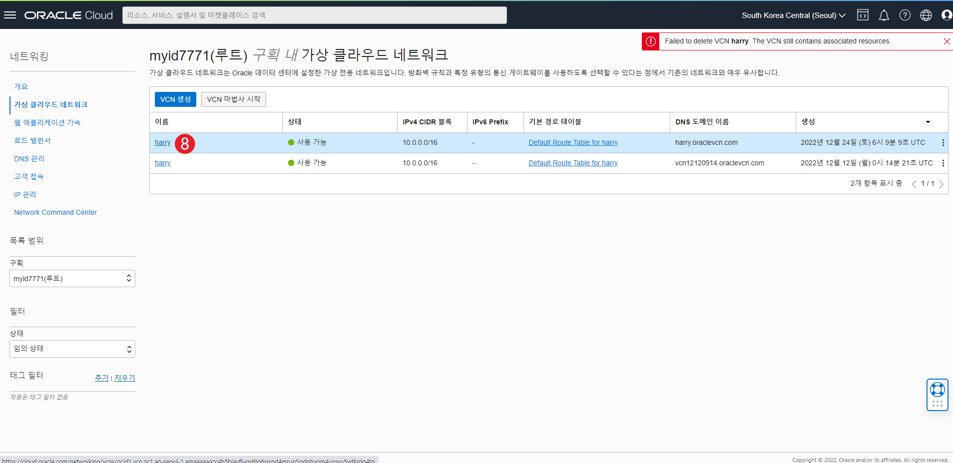 4. 로그인하고 네트워크 ▶ 가상 클라우드 네트워크 ▶ VCN 마법사 ▶ VCN 마법사 시작 ▶ 이름 기입 ▶ 다음 버튼