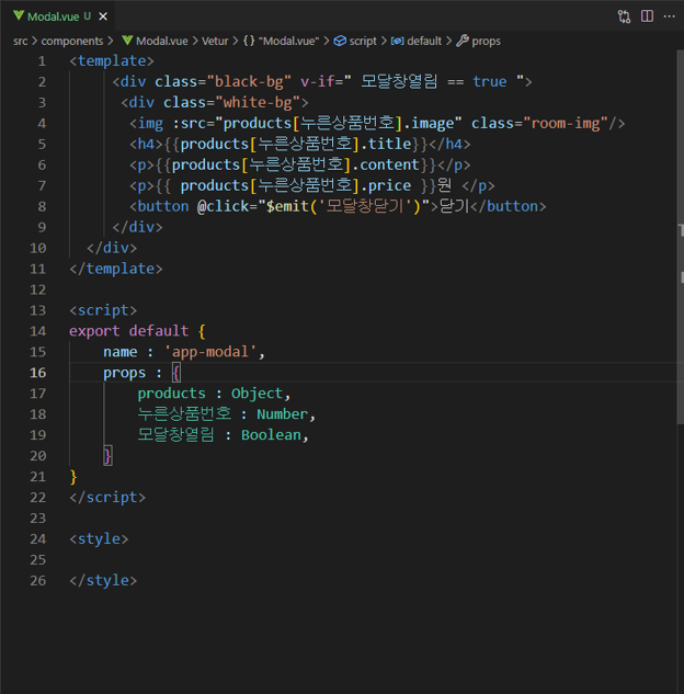 부모는 @모달창닫기를 실행 "모달창닫기()" 함수를 통해서 모달창열림 데이터를 바꾸고 $event로 products.id 데이터를 받아서 누른 상품번호에 입력. 신고버튼 클릭 시 @increase를 실행 "increase(i)" 함수를 통해서 products [i]. fakeReport 변소를 바꾸고 다시 자식에게 던짐