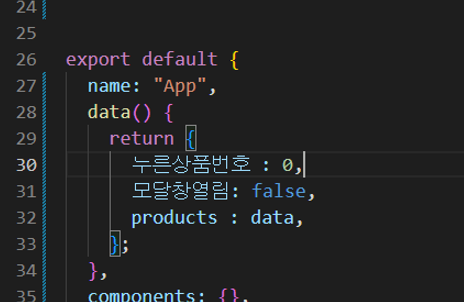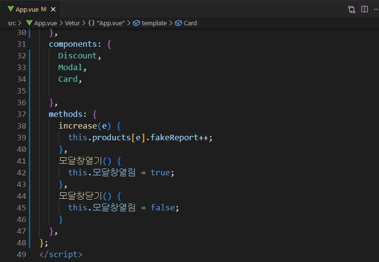 <Card v-for="(a, i) in products" :key="a":products="products [i]"@모달창열기="모달창열기(); 누른 상품번호=$event@increase="increase(i)" />